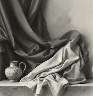 Alle meesters hebben gestoeid met de vouwen en glooiingen van stoffen, nu jij ! De eerste weken ga je met houtskool aan de slag, je tekent de lappen in het Het LaB ; van grof & groot, tot fijn & satijn , veel aandacht voor de opzet want vaak verdwaald men in alle lijnen. Om de tekeningen nog meer te laten spreken stappen we over op getint papier, in plaats van het licht uitsparen tekenen we het licht er op met zwart en wit krijt. Genoeg voorbeelden van b.v. Da Vinci en Dürer. De laatste twee weken zijn voor je eigen project: een afbeelding van Het LaB of van je eigen foto of voorbeeld.
